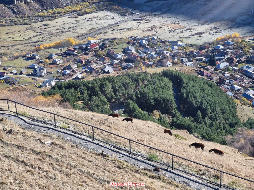 เดินขึ้นไปก็พอเหนื่อยนะ ขึ้นถึงแล้วก็หายเหนื่อยกับบรรยากาศดีๆ นั่งเล่นจนพอใจก็เดินกลับลงมา (ขากลับกลิ้งลงเขามากางเกงเละเลย เพราะเดินไปเจอทางลื่นโคลน) ลงมาก็ช่วงบ่ายๆ นึกเสียดายว่า ถ้านอนใน Kazbegi อีกสักคืนก็น่าจะดี จะเป็น 2 วันที่ชิลมาก ไม่ต้องเที่ยวเยอะ แต่วิวสวยบรรยากาศดี ใครมีเวลาแนะนำนอน 2 คืน แต่เราวางแผนนอนคืนเดียว จาก Juta ก็ขับย้อนถนน E117 ออกไปตามเดิม คืนนี้ไปนอนที่ Mtskheta