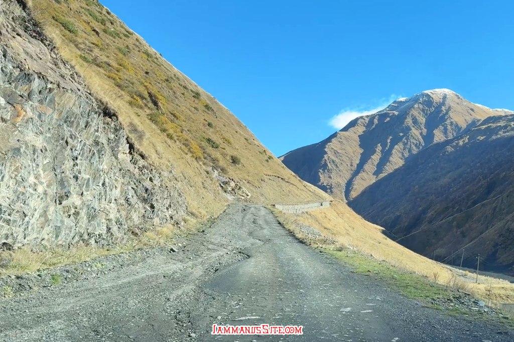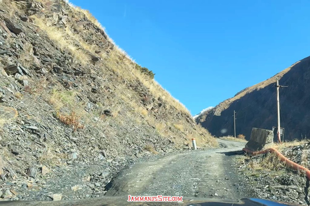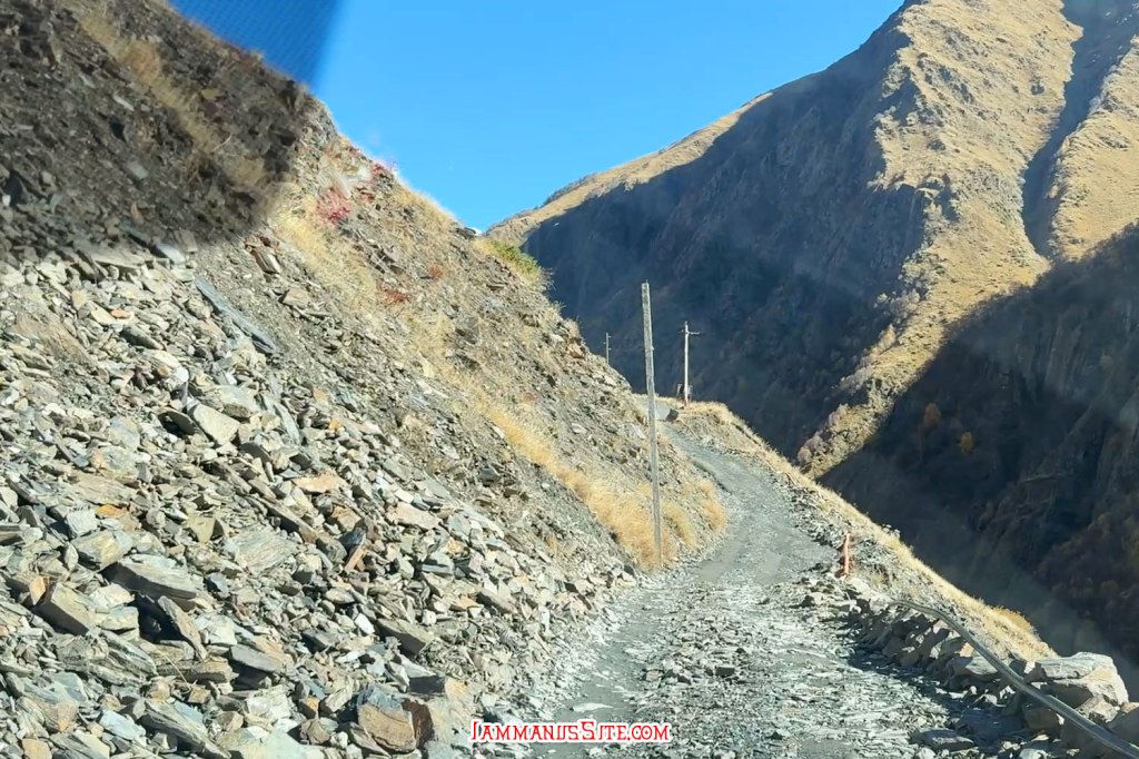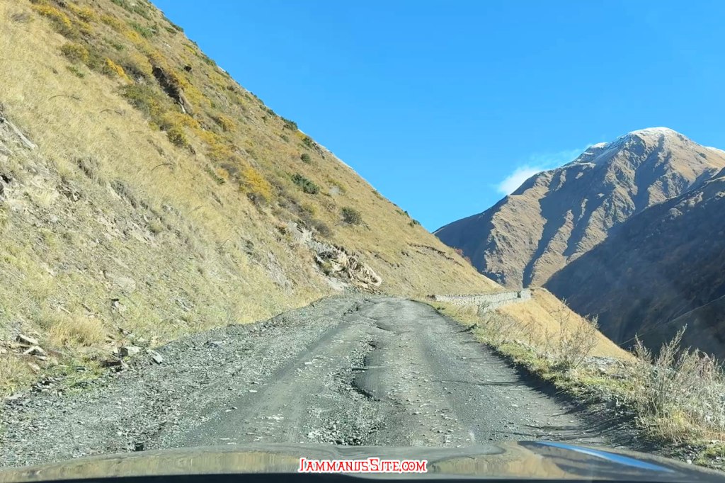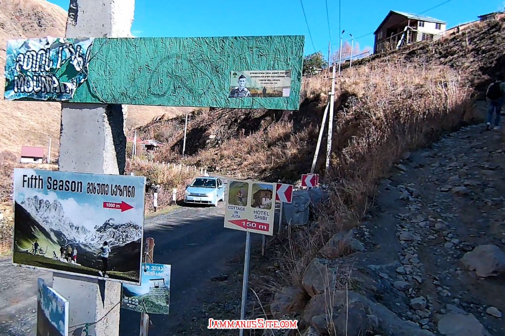 ช่วงสายๆลงจากโบสถ์ก็มาเก็บของออกเดินทาง วันนี้จะไป Juta หมู่บ้านเล็กๆที่นักเดินทางหลายคนอยากไปให้เห็นวิวอันสวยจับใจ (อารมณ์อุปทานหมู่ ต้องไปๆ เราก็ด้วยแหละ) ขับรถออกมาจาก Kazbegi 5 กม. ก็เลี้ยวซ้ายตามป้ายบอกทางไป Juta แล้วขับต่อไปอีกประมาณ 16 กม. ทางก็ไม่ได้แย่มาก จะไปแย่ก็ช่วง 1-2 กม.สุดท้ายที่หลายๆรีวิวบอกว่า เจอทางปิดไปต่อไม่ได้ต้องจอดรถแล้วเดินต่อไปตัวหมู่บ้าน บางคนบอกว่าพอเดินพ้นจุดกั้นถนนจะมีรถมาคอยรับจ้างขับไปส่งในหมู่บ้าน แต่ตอนที่เราไปโชคดีอยู่ ที่มีป้ายบอกทางปิดแต่ไม่ได้กั้นทาง ซึ่งส่วนมากเขาจะกั้นปิดเพราะมีคนทำงานก่อสร้างถนน แต่วันนี้ไม่มีคนทำงาน ไม่ได้กั้นปิดทาง ก็ขับต่อเข้าไปได้เลย ทางค่อนข้างแย่ แต่รถ SUV ขับได้สบายๆ ขับไปต่อได้ถึงตัวหมู่บ้านเลย