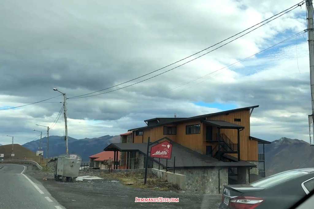 ไปถึง Gudauri ก็บ่ายโมงกว่าๆ ตัดสินใจแวะโรงแรม Monte Hotel อันโด่งดัง เพราะอยู่ริมถนนเลย เข้าไปในส่วนโถงรับรองไม่เจอใคร เดินเข้าไปได้ถึงห้องอาหาร ก็ยังไร้ผู้คน เดินจนทั่วไม่เจอมนุษย์เลย ขนาดตรง Reception ยังมีป้ายบอกคนที่จะ Check out ว่าเอากุญแจ drop ไว้เลยนะ ไม่น่ามีพนักงานมาทำงาน ร้านอาหารก็ปิด อดกินข้าวแน่นอน เลยขับวนเข้าไปในส่วนที่เป็นที่พักโรงแรมต่างๆ คือทุกที่ปิดหมด มีคนงานมาซ่อมสร้างอะไรนิดหน่อย ร้านอาหารก็ปิดหมด ยังไม่ถึงฤดูสกี ที่ Gudauri คือเมืองร้าง เลยต้องขับรถต่อไปแบบหิวๆ