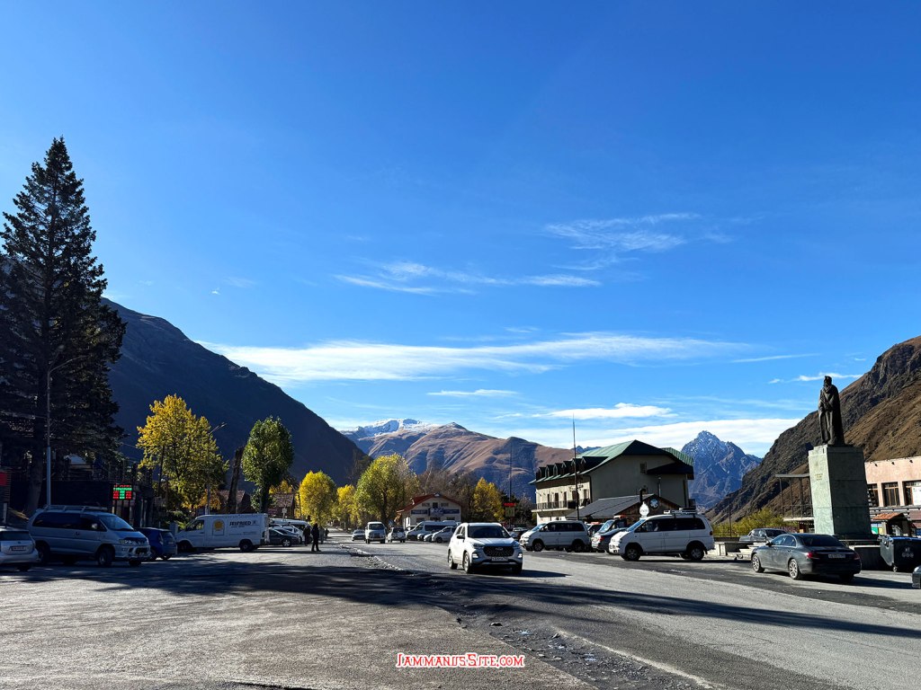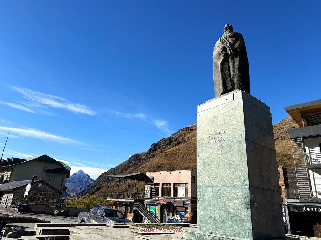 รูปปั้น Alexander Kazbegi นักเขียนชาวจอร์เจียที่เกิดที่เมืองนี้ เคยถูกเอานามสกุลมาตั้งเป็นชื่อเมือง