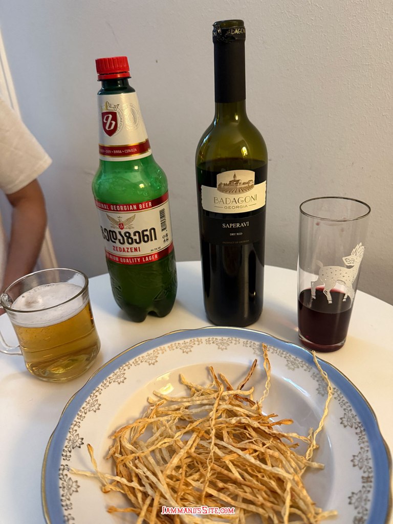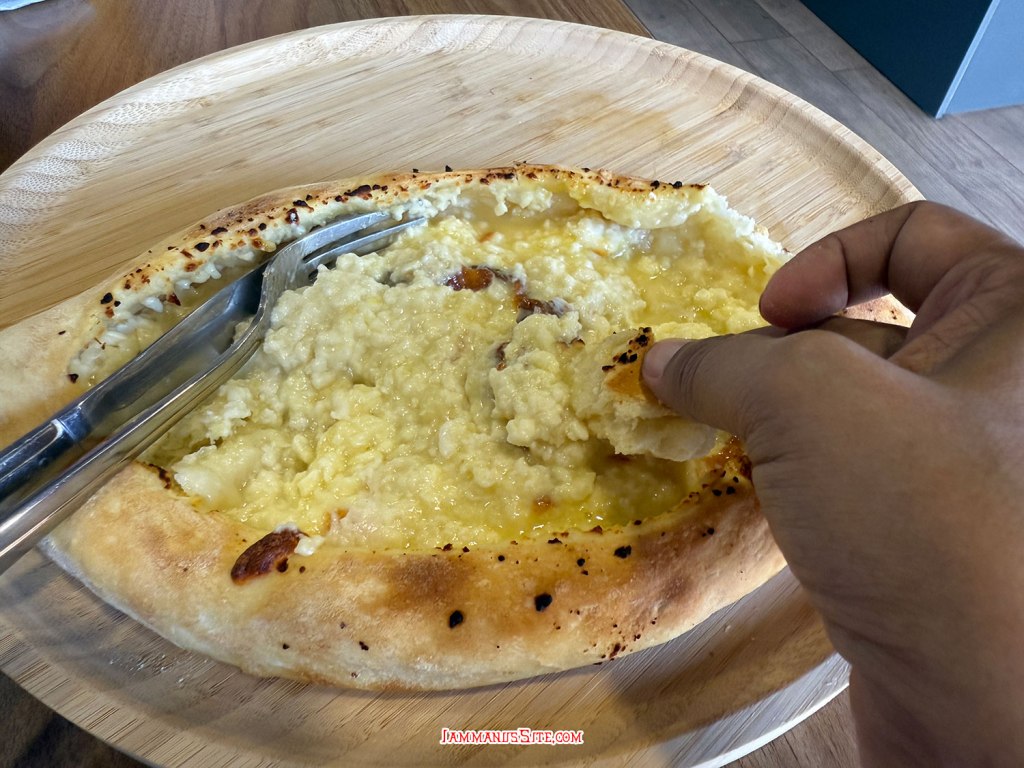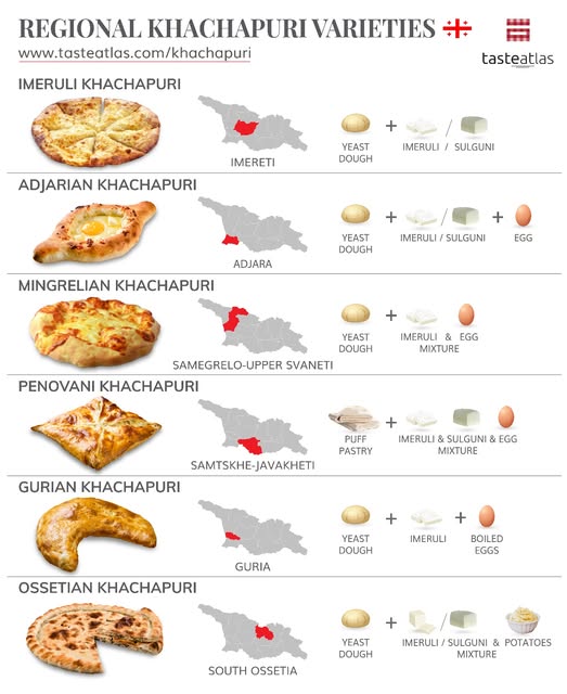 Khachapuri อาหารท้องถิ่นของจอร์เจีย ทำจากแป้งยีสต์นุ่มๆ สอดไส้ชีส อบในเตาอบหรือบนเตา Khachapuri มีหลายแบบ เป็นเอกลักษณ์ตามแต่ภูมิภาค เช่น Adjarian Khachapuri (Acharuli) น่าจะเป็นอันที่หลายคนคุ้นเคยหน้าตา แผ่นแป้งทำเป็นทรงรีคล้ายเรือ ตรงกลางใส่ชีสและไข่ไก่ ซึ่งมันมีความหมายลึกซึ้งว่า ออกแบบให้คล้ายเรือ สะท้อนถึงต้นกำเนิดในภูมิภาค Adjara ริมทะเลดำ ไข่แดงตรงกลางเป็นสัญลักษณ์ของดวงอาทิตย์ เวลาจะกินก็คลุกชีสกับไข่ผสมกัน แล้วฉีกแผ่นแป้งมาจิ้มกิน แบบอื่นเช่น Imeruli khachapuri จะเป็นแผ่นแป้งกลมคล้ายพิซซ่าสอดไส้จอร์เจียนชีส มักจะอบบนกระทะดินเผา (ketsi) ในเตาผิงตามวิธีดั้งเดิมของภูมิภาค Imereti ส่วน Megrelian khachapuri เหมือน Imeruli แต่ใส่ชีส 2 ชนิด หรือ Gurian Khachapuri ขนมอบรูปจันทร์เสี้ยวจากภูมิภาค Guria เป็นแผ่นแป้งพับสอดไส้ด้วยชีสและไข่ต้มสับ ดูเหมือนรูปพระจันทร์เสี้ยว ชาวกูเรียนทำขนมนี้สำหรับคริสต์มาส จึงเรียกง่ายๆ ว่า “Christmas pie” บางคนก็เรียกว่า “Gurian pie”