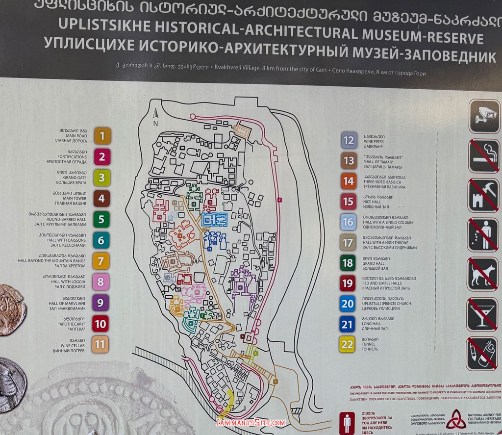 การเที่ยวเมืองถ้ำอุพลิสชิเค มีค่าเข้าชมคนละ 15GEL ใครอยากฟังคำบรรยายก็มีไกด์ภาษาอังกฤษพาเดินชม หรือเช่าเครื่องฟังบรรยายได้ แต่เราเดินกันเอง อาศัยอ่านป้ายตามจุดต่างๆเอา ทางเดินเป็นบันไดบ้าง ไต่หินบ้าง ที่สำคัญแดดแรงและร้อนมาก ใส่รองเท้าสบายๆและควรใส่หมวกด้วย ดูจากแผนที่แล้วเดินไล่ไปตามทางเดิน เป็นจุดๆตามหมายเลข จะดูให้ทั่วสามารถเดินวนรอบได้ ใช้เวลาสัก 1-2 ชม. แต่อย่างน้อยควรเดินขึ้นไปให้ถึงโบสถ์บนยอดเขา บางคนก็เดินย้อนกลับเลย บางคนก็เดินต่อไปเพื่อวนลงอีกด้าน