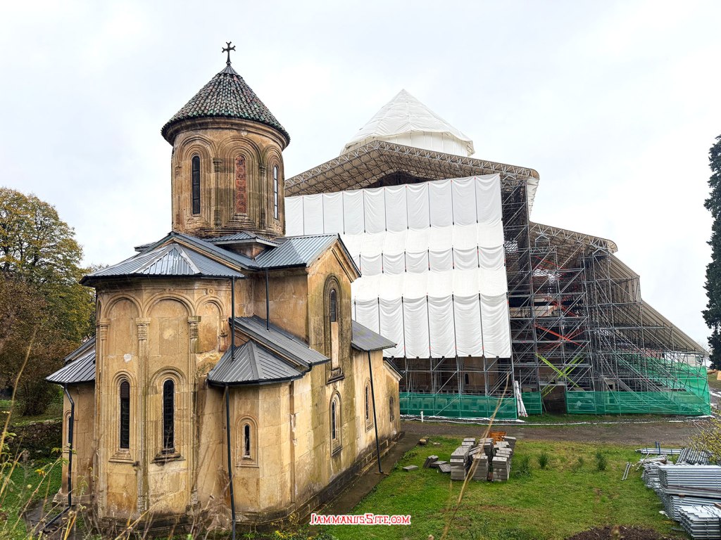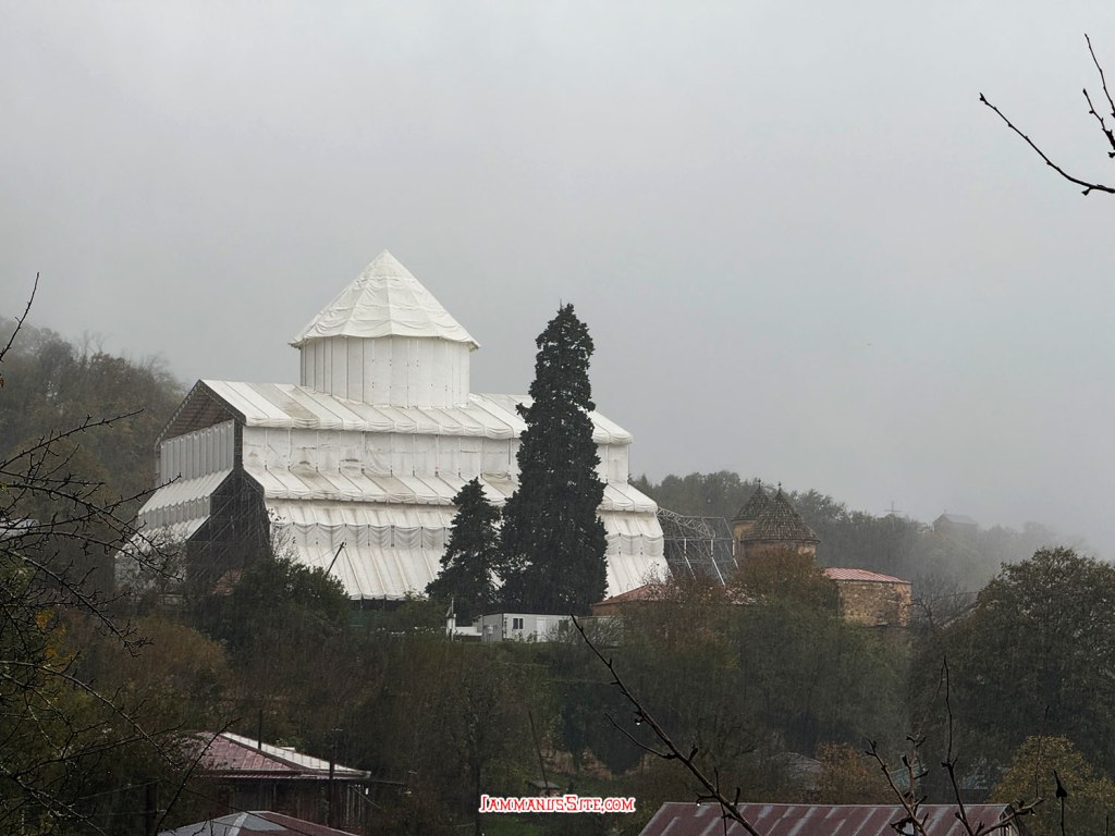 Gelati Monastery ช่วงซ่อมแซมห่อมิดชิดด้วยผ้าใบสีขาว ที่มองเห็นบนเขามาแต่ไกล