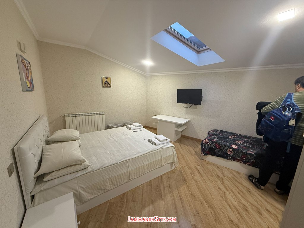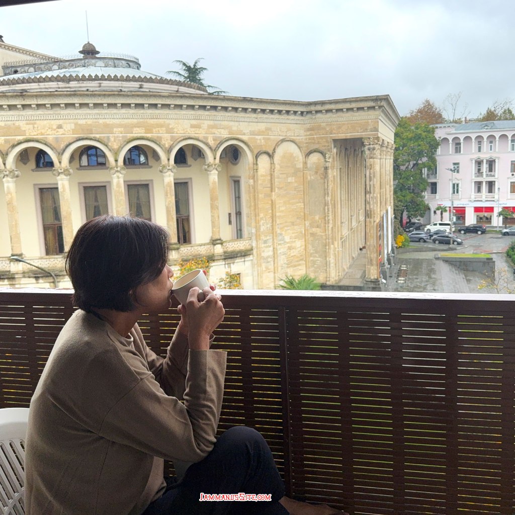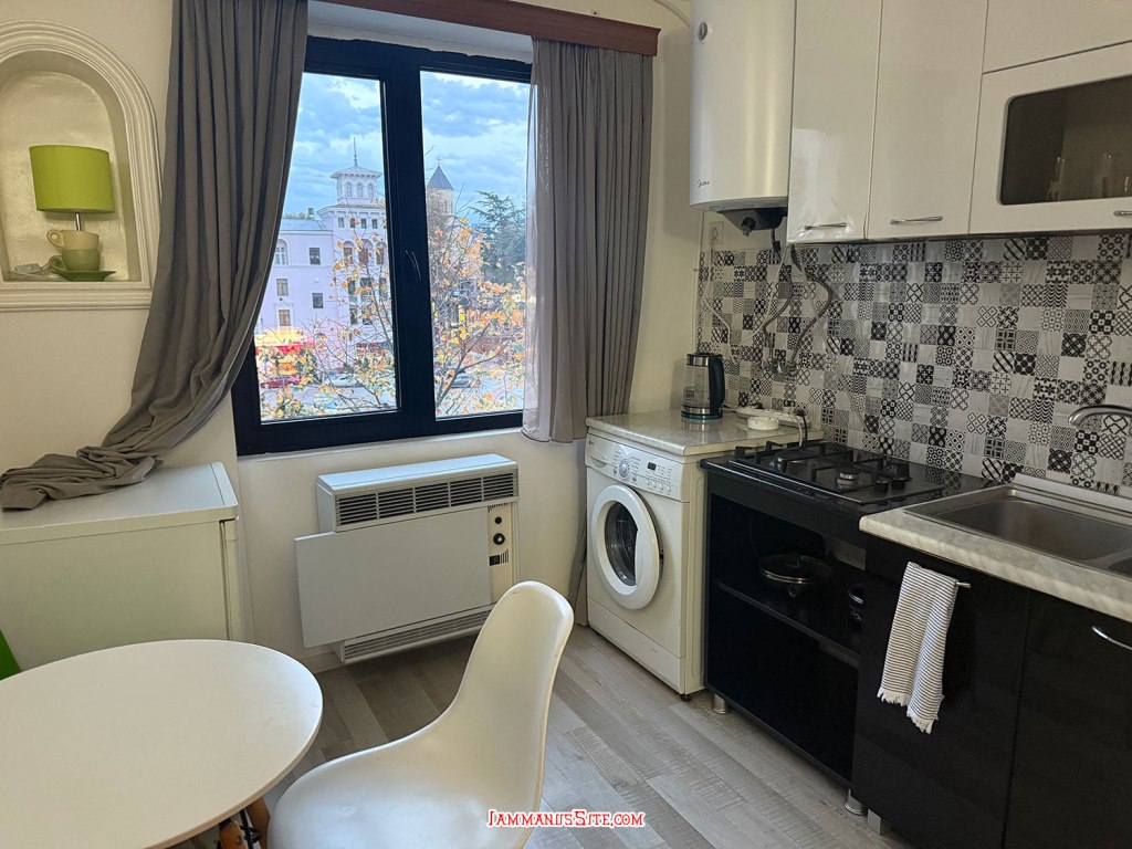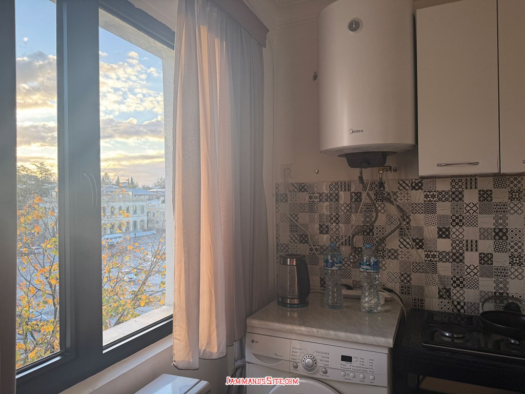 เลือกโรงแรมนี้จากทำเลที่อยู่ใกล้วงเวียนน้ำพุ Colchis Fountain จะได้จอดรถแล้วเดินเล่นได้เลย เพราะเป็นย่านที่เดินเที่ยวของเมืองเลย ปัญหาของที่พักแบบอพาตเมนต์คือ หายาก ต้องติดต่อเจ้าของและนัดหมายดีๆ เจ้าของห้องนี้ดีมาก พอกดจองปุ๊บ ทัก WhatApp มาทันทีเลย และใกล้วันเข้าพักก็ทักมาอีก ถามตลอดว่าจะมาถึงกี่โมง ส่งรูป ส่งคลิป มาให้ดูว่าอยู่ตรงนี้นะ แต่ดีขนาดนี้แล้วก็ยังต้องวนรถ 2 รอบ เพราะหาที่จอดไม่ได้เลย พอทักบอกไปว่าหาที่จอดไม่ได้ ป้าแกบอกว่า มีลานจอดรถของที่พัก แต่เธอต้องมาเจอฉันก่อน เดี๋ยวฉันพาไปเพราะมันต้องใช้รีโมทกดเปิด ก็ทุลักทุเลนิดหน่อยกว่าจะได้เจอกัน แล้วก็พาไปดูลานจอด ที่ความจริงเราวนไปตรงนั้นแล้ว เจอไม้กั้นปิด ก็เลยวนออกมาหาที่จอดริมถนน ที่แท้มันเป็นที่จอดของตึกที่พักนั่นเอง