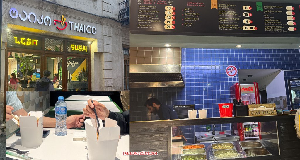 เดินหาร้านมื้อเย็นวนไปวนมาไปจนถึง Veriko Anjaparidze Squareb ที่ไปเมื่อบ่าย ไม่ถูกใจร้านไหนเลย เดินย้อนกลับ ตัดสินใจเลือกร้านชื่อไทย แต่เข้าไปดูมันเหมือนร้านอาหารตามสั่งแบบร้านจีน เลยลองดู อยากได้อารมณ์เหมือนซีรีย์เมืองนอก กินอาหารจีนกล่องกระดาษ ราคาถูกดีด้วย อิ่มไปอีกมื้อ ปล. ไม่อร่อย