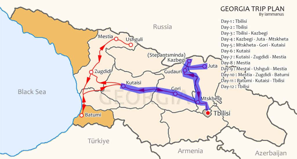 ตอนที่ 1 ลุยทบิลิซี 2 วันเต็มๆ ตอนที่ 2 เปิด Road Trip กันยาวๆ ขับออกจากทบิลิซี ขึ้นทางเหนือ ผ่าน Gudauri (ไม่ได้แวะเที่ยว เพราะ Ski resort ยังไม่เปิดจนเดือนธันวาคม ขับผ่านแล้วเหมือนเมืองร้าง) ต่อไปที่ Kazbegi หรือ Stepantsminda นอน 1 คืน (บรรยากาศดีมาก เสียดาย น่าจะนอนสัก 2 คืน) แล้วขับออกมาแวะเที่ยว Juta แล้วขับลงมานอนที่ Mtskheta อีก 1 คืน วันรุ่งขึ้นขับไปแวะเที่ยว Gori เมืองบ้านเกิดสตาลิน แล้วไปต่อถึง Kutaisi นอนที่ Kutaisi 2 คืน ถนนดีตลอดเส้นทาง มีทางเข้าไปหมู่บ้าน Juta ที่ทางไม่ค่อยดีช่วงท้ายๆหน่อย