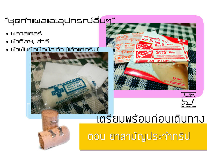 [อาจแยกยาแก้ท้องเสียไว้กับตัวนิดหน่อยก็ได้เผื่อท้องเสียช่วงยังไม่เข้าที่พัก พลาสเตอร์ติดแผลด้วยแบ่งเอาไว้ใช้ระหว่างเดินทาง]