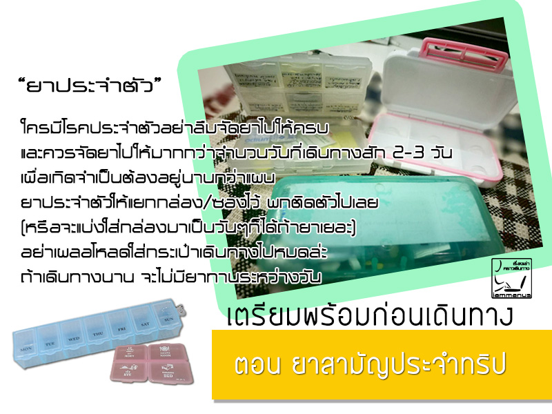 สำหรับคนมีโรคประจำตัว อย่าลืมจัดยาไปให้ครบ และควรเอายาไปให้มากกว่าจำนวนวันเดินทางเล็กน้อย เผื่อกรณีต้องเดินทางนานกว่าแผน จะได้มียาทาน ยาที่ต้องทานเป็นประจำให้แยกกล่องต่างหากเก็บไว้ในกระเป๋าที่พกติดตัว หรือจะเอาทั้งหมดเก็บไว้ในกระเป๋าเดินทาง แล้วจัดยาใส่กล่องเล็กเป็นวันๆเพื่อพกติดตัวก็ได้